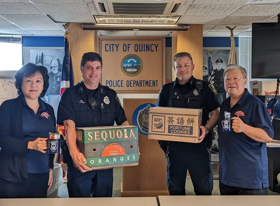 Wilson and Esther Lee presenting Oranges and Fortune Cookies to the Quincy Police Department at their Headquarters